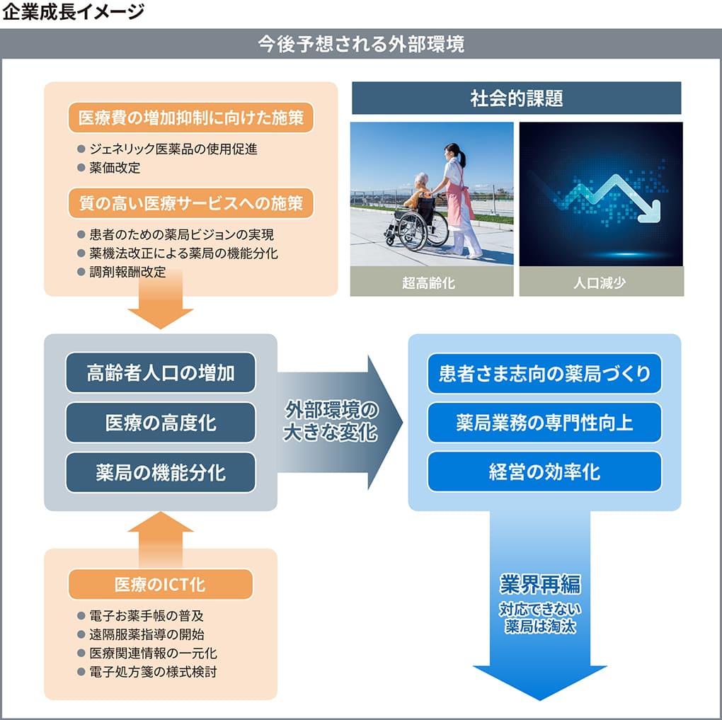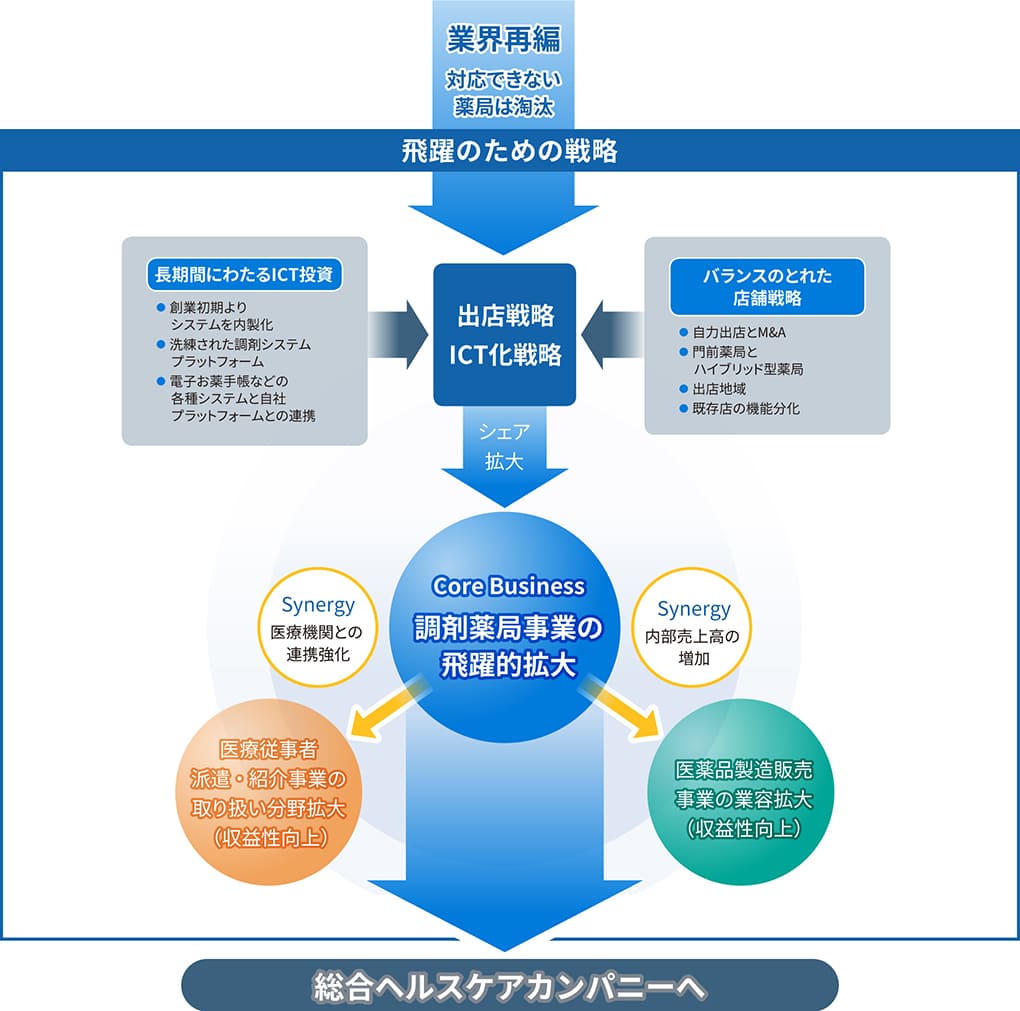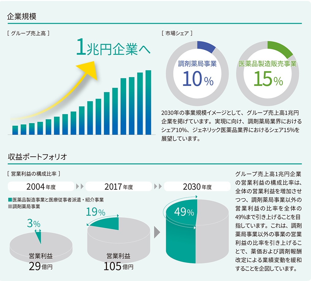 日本調剤グループの長期ビジョンは、医療・医薬品業界における外部環境の大きな変化をチャンスと捉え、業界再編を勝ち抜いた先の、当社グループ像をお示しするものであります。出店戦略、ICT化戦略を進めることで調剤薬局事業の飛躍的拡大を実現し、これを起点に医薬品製造販売事業と医療従事者派遣・紹介事業を拡大させ、総合ヘルスケアカンパニーとして持続的な成長を実現してまいります。
