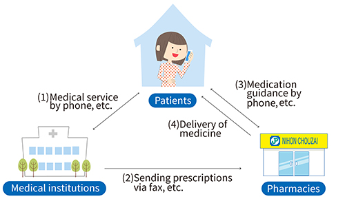 With the spread of COVID-19, it has become difficult for people to receive medical treatment at medical institutions. Based on a notice issued by the Ministry of Health, Labour and Welfare on April 10, 2020, measures have been taken on an exceptional, limited time basis to enable delivery of medicine, as well as medication guidance using information communication devices such as by telephones and video calls at pharmacies.